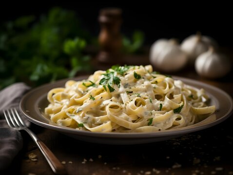 AI generated illustration of a bowl of gourmet fettuccine alfredo