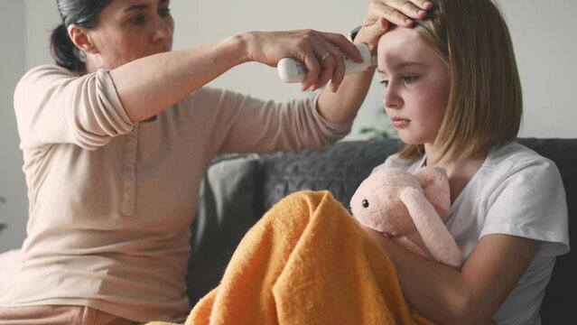 mother is measuring high temperature to her sick daughter by electronic thermometer, little girl has a fever due to virus