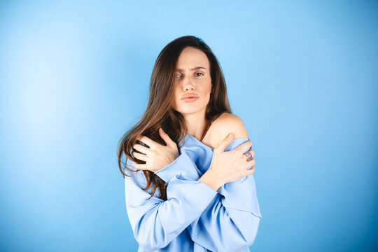 Young woman freezes in long sleeves top warms up by hugging herself, seasonal changes low temperature heating problem, looks at camera, chills feeling of coldness concept, isolated on blue background.