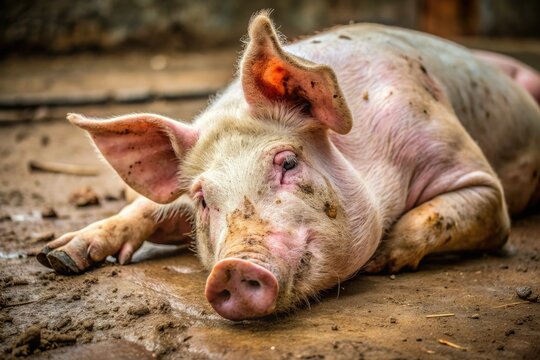 A sick pig lies on the ground, Skin lesions and paralysis evident, suffering from African Swine Fever, a highly contagious and deadly disease affecting swine populations.
