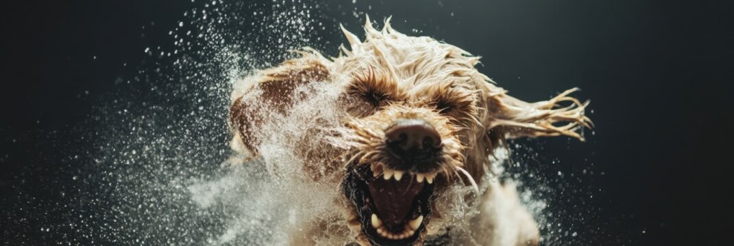 Dog shakes off water after a bath creating a hilarious grooming fiasco filled with splashes and chaos