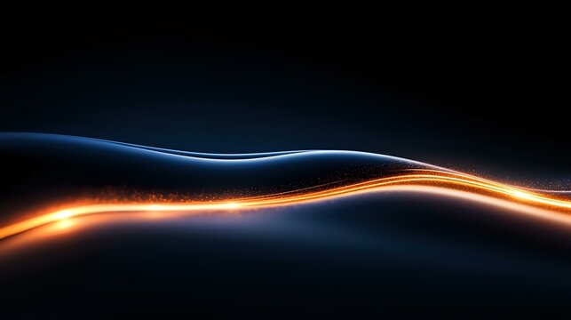 Glowing orange and blue light waves with sparkling particles flow against dark background creating dynamic energy effect for technology designs.