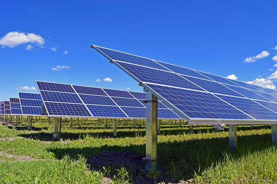 A solar park in the beautiful countryside on a sunny day. Generative AI.
