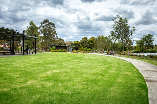 Aerial view green public park in downtown Dallas, Texas, USA in summer sunny day. Trees lush and grassy lawn for outdoor exercising, workout and recreation activities