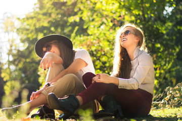Two friends enjoying autumn day in the park