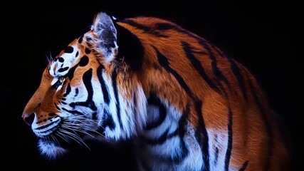 Tiger wild animal orange fur black stripe big cat predator walking isolated white background powerful majestic fierce alert expression, captivating