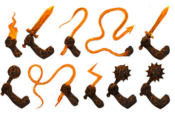 Different types of weapons and elements shown in a creative art style with fiery effects in various poses