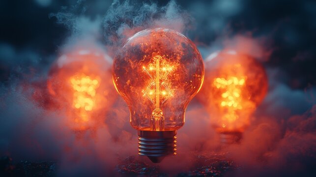 A bright incandescent light bulb glows with a fiery orange light against a red and dark background.