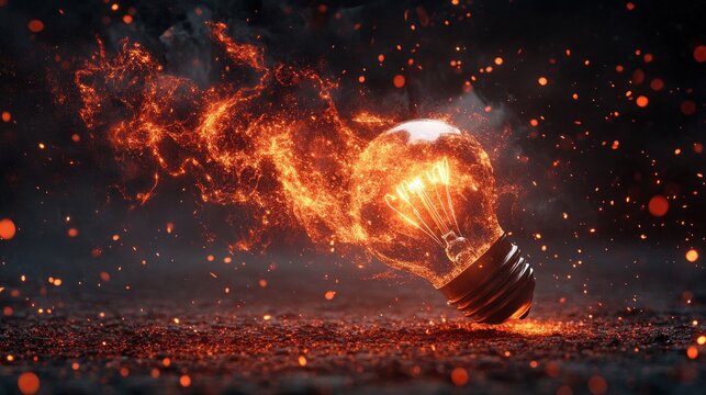A glowing light bulb surrounded by fiery sparks and swirling energy.