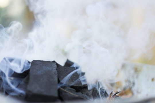 Slow motion , Close up view of glowing flying fire flame from hot bonfire charcoal