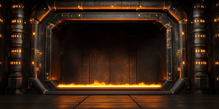 dramatic interior scene featuring fantastical oven with glowing elements and fiery base, set against dark metallic backdrop. atmosphere evokes sense of mystery and intrigue