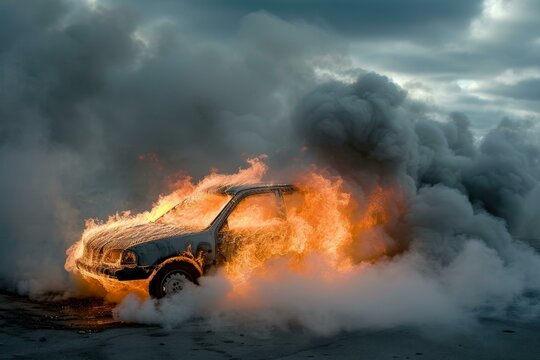 Dramatic scene of a car engulfed in fiery flames and smoke under a stormy sky