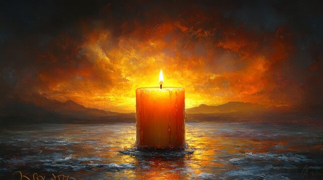 A single candle flame burns brightly against a fiery sunset backdrop reflected on calm water.