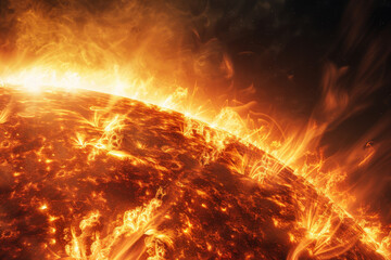 Fiery sun close-up with intense flames and cosmic background.