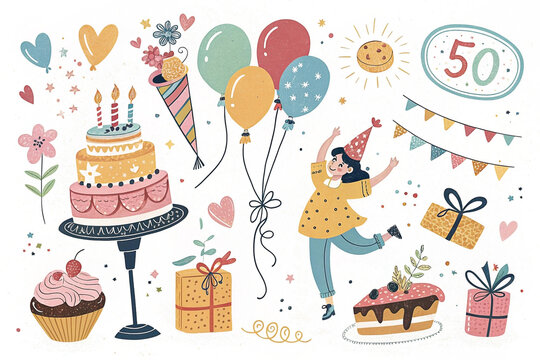 Festive 50th birthday celebration with cake, balloons, gifts, and a joyful person.