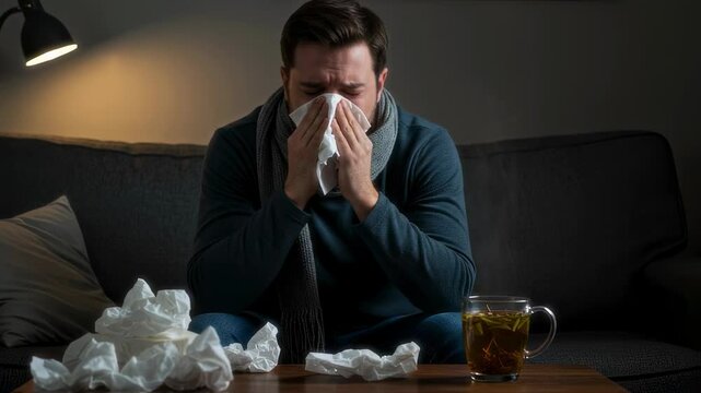 A sick man sits on a couch, sneezing into a tissue with a pile of crumpled tissues around him. A cup of hot tea nearby highlights his struggle with a cold or flu