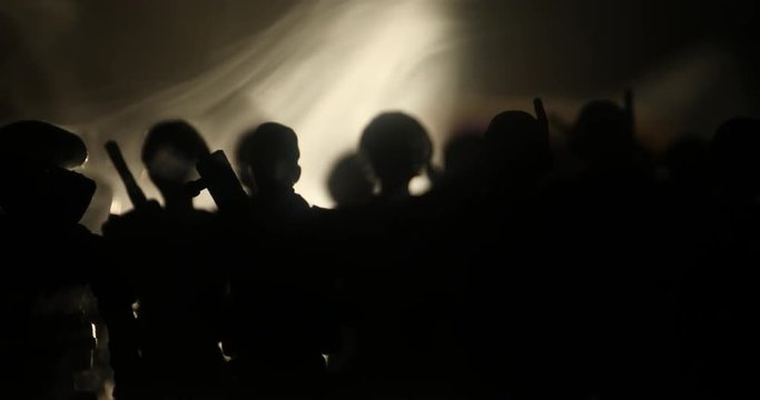 Anti-riot police give signal to be ready. Government power concept. Police in action. Smoke on a dark background with lights. Blue red flashing sirens. Dictatorship power