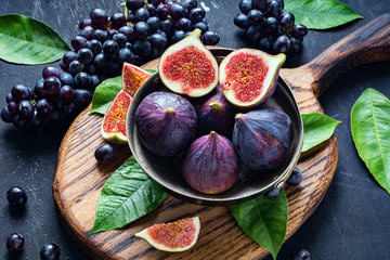 Fresh ripe figs and black grapes on wooden chopping board. Concept of freshness, healthy food, fresh fruits, summer market harvest and colors.