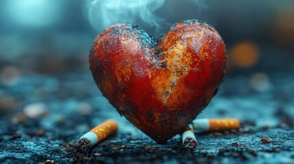 Burning heart figurine with cigarette butt on dark ground, symbolizing emotional pain, unhealthy habits, addiction consequences, sad mood, conceptual art, smoking awareness, loneliness
