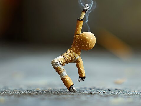 A small figurine sits on a cigarette, symbolically pondering personal choices and the health implications of smoking, in a creative and thoughtful display.