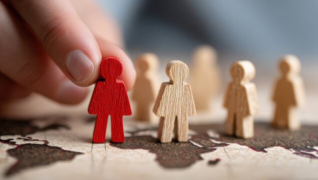 A red figurine under a magnifying glass surrounded by white figurines, symbolizing focus or analysis.