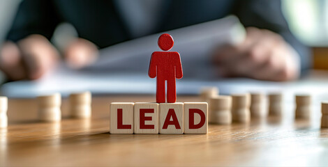 Wooden blocks with the word LEAD and a red figurine on top, signifying leadership