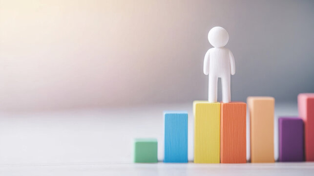 A figurine stands atop colorful blocks, symbolizing growth and achievement in business or personal development.