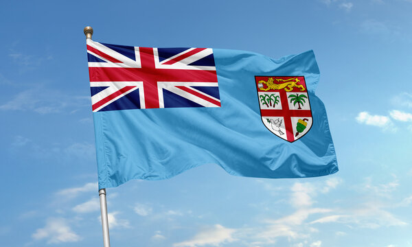 Fiji national flag with Union Jack and shield emblem waving in sky