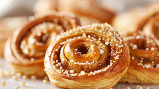 Close-up image of swedish kanelbullar, traditional cinnamon buns topped with pearl sugar, perfect for fika or breakfast pastry display