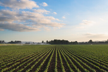 Corn plantation on the background of sunset and blue sky, Sunrise Farm Field, A beautiful corn filed and background with sun shines