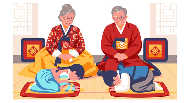 Korean Sebae Tradition Respectful Bows to Elders During Seollal.