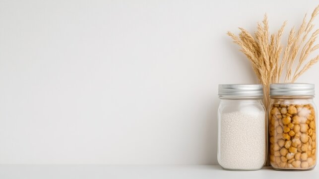 Two glass jars filled with grains and flour on a white shelf with dried wheat stalks, minimalist kitchen setting, and rustic and natural composition.