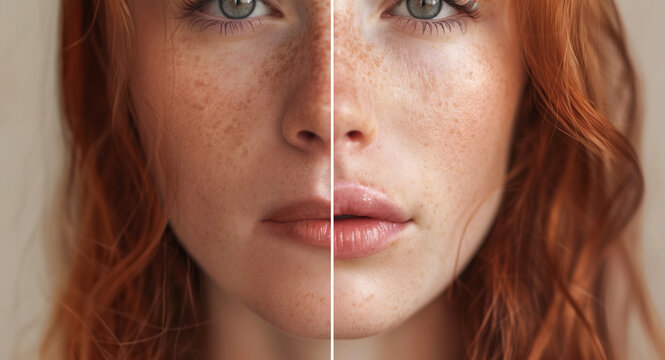 Portrait shot of young ginger woman's face with lips before and after lip enhancement. Injection of filler in lips. Lip augmentation.