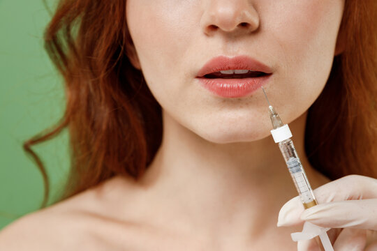 Cropped up photo shot half naked topless redhead woman with nude make up visit doctor make filler lip augmentation isolated on pastel green background Skin care healthcare cosmetic procedures concept