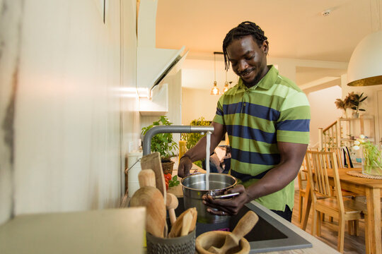 Smiling young man filling pot from faucet in kitchen