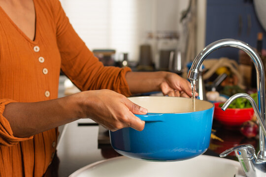 Close-up of a woman's hands holding a pot filling it with water in the kitchen sink