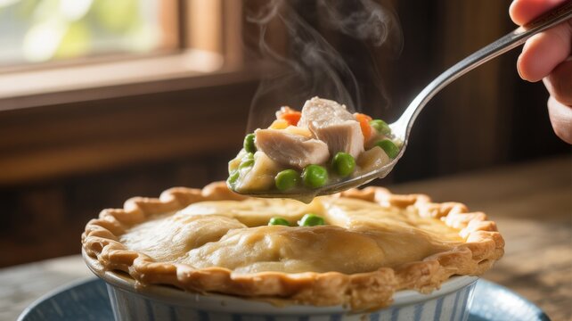 Steaming chicken pot pie with vegetables in a bowl near window