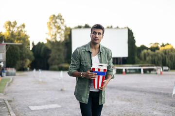 Young man buying popcorn at the drive-in cinema