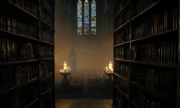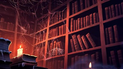 An eerie library filled with dusty books and a flickering candle