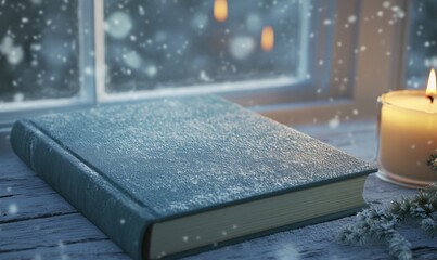 Winter mockup of a blank book cover resting on a snowy windowsill, with frost patterns on the glass and a cozy candle flickering nearby