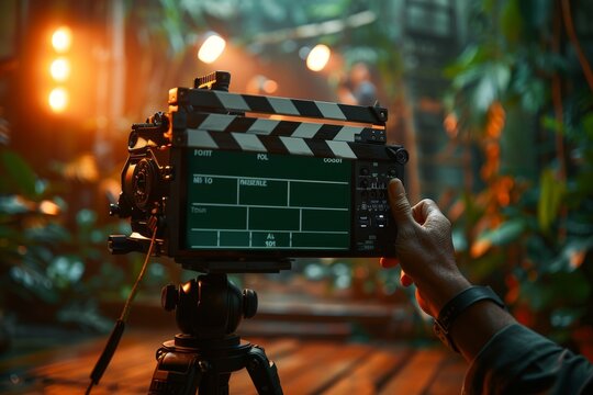 An open film clapperboard ready for a take on a vibrant movie set with cinematic lighting and a tropical backdrop