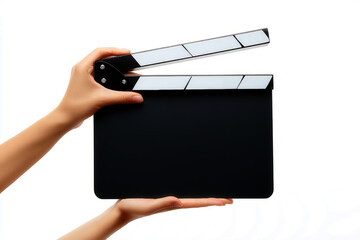 Minimalist clapperboard animation on white background, black and white film slate icon snapping shut in flat style.