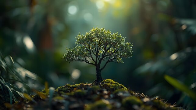 A cinematic macro of a small tree in a lush jungle with dramatic lighting and vibrant filmic tones.