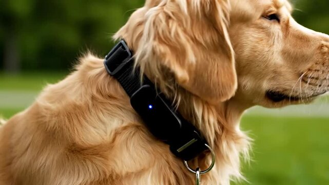 Close up dog wearing smart collar GPS tracker cinematic UHD handheld pet tech lifestyle stock video. canine face intelligent collar location device filmic ultra high definition