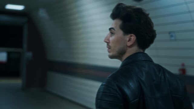 Handsome man in a leather jacket walks through a dimly lit underground subway tunnel, creating a cinematic urban night atmosphere.