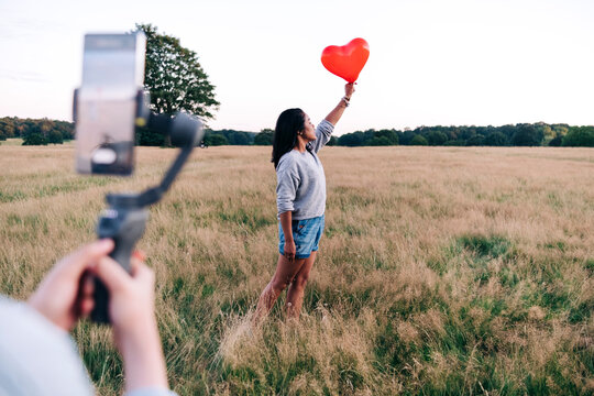 Cropped hands of woman with smart phone filming teenagers dancing on street in city