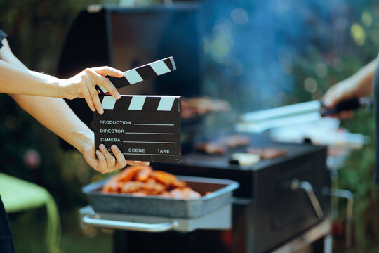 Worker Holds a Film Clapper Shooting a Summer Barbecue Commercial. Film maker creating a slice of life scene in a movie