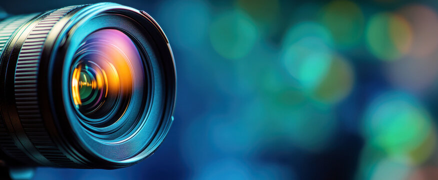 close-up of a camera lens, illuminated by blue light on a dark background. Photographer and filmmaking background concept with copy space