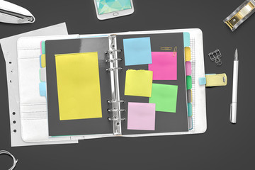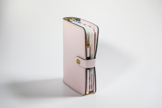 Colorful Planners Casting Shadows on a Sunlit, Weathered White Tabletop