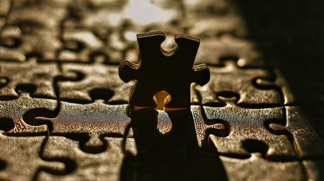 Final Puzzle Piece Engagement, nearly completed puzzle with dramatic shadows cast by directional lighting